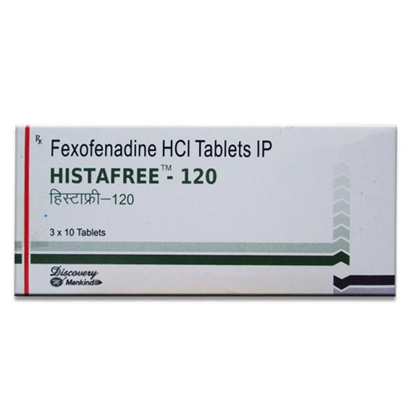 Histafree 120 Tablet is an anti-allergy medicine used in the treatment of allergic symptoms such as runny nose, congestion or stuffiness, sneezing, itching, swelling, and watery eyes. It also helps treat skin allergies with itching, redness, or swelling.