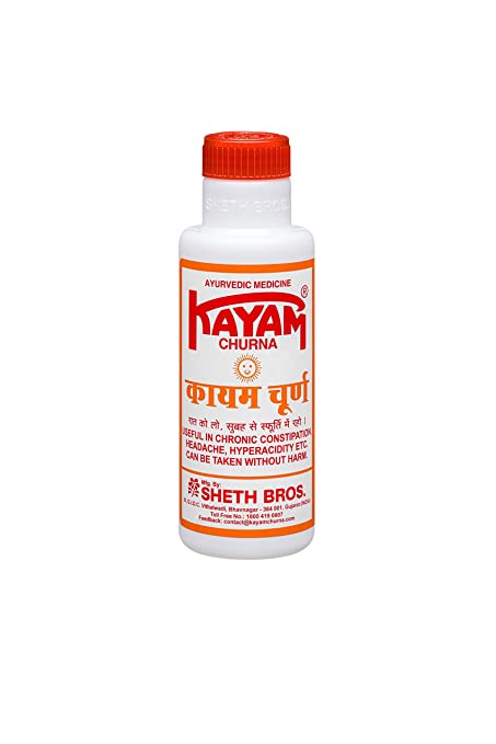 Kayam Churan contains a blend of Senna Leaves, Black Salt, Nishoth, Himej, Svarjika Kshara, and Jethi Madh. It is an ayurvedic formulation to treat constipation.