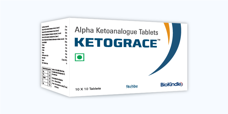 Ketograce Sachet is used for the prevention of deficient protein metabolism in kidney diseased patients with glomerular filtration rate (GFR) less than 25 ml/min. Patients are advised to take limited protein intake of not more than 40 grams per day while receiving this medicine. It is also used in the treatment of diabetic nephropathy for slowing down the progression of kidney failure.