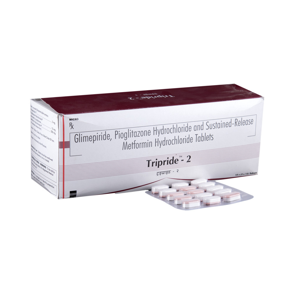 Tripride-2 Tablet 15’s belongs to a class of medicines called anti-diabetic drugs used in the treatment of type 2 diabetes, especially in patients whose blood sugar levels are not controlled by diet and exercise alone. Type 2 diabetes is a chronic (long-lasting) condition that affects the way our body processes glucose. People with type 2 diabetes either do not produce enough insulin or the insulin produced is unable to perform its function in the body (insulin resistance).